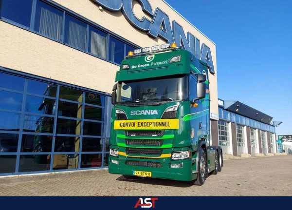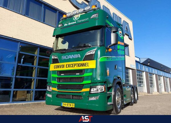 De meest recent aan transportbedrijf De Groen geleverde trekker is bijna een ‘standaard uitvoering’ te noemen voor deze transporteur; terwijl er weinig standaard is aan deze trekker! Een sterke 530pk V8 en een ruime S-cabine, deze keer met 6×2/4 asconfiguratie. Wat is daar standaard aan!?
